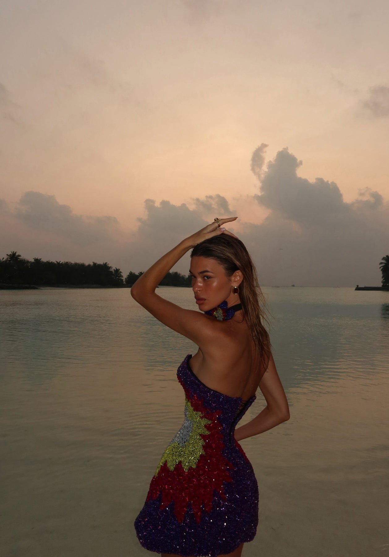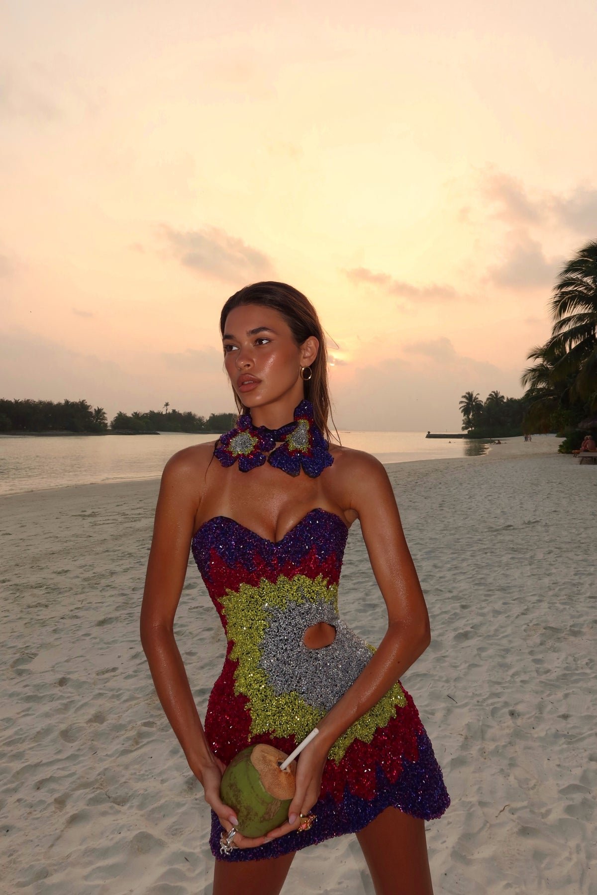 100% Handmade Dress. This dress is entirely handcrafted and sculpted directly on the body using intricate beadwork. The design is created with beads in multiple colors, carefully placed one by one by hand directly onto the dress to form bold shapes and vibrant color transitions. The silhouette is strapless and features a sculptural cut-out detail at the waist, enhancing the body line while maintaining a refined couture balance. The dress comes complete with a matching beaded necklace, handcrafted in the same floral beadwork design. The necklace is fully made by hand and designed to complement the dress as part of a cohesive couture set. Color Details: – Beadwork: deep purple, red, green, and silver tones – Necklace: matching beaded floral design Each piece is entirely handmade, making every dress unique. COMPOSITION & CARE ONLY PROFESSIONAL CLEANING. Model is wearing Size S.