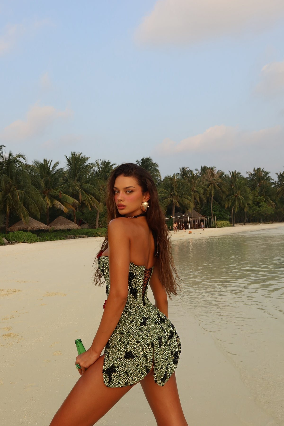 100% Handmade Dress. This dress is entirely handcrafted and fully embellished with beadwork, with each bead individually placed by hand directly onto the garment. The beadwork creates rich texture and sculptural depth throughout the entire piece. The design features bold floral details made from red beads, meticulously shaped by hand to create dimensional flower appliqués that stand out against the beaded base. A strong internal corset is built into the dress, designed to sculpt the waist and enhance the silhouette, delivering a defined hourglass effect while providing structure and support. The strapless silhouette is carefully shaped to frame the bust and body with precision and couture craftsmanship. Color Details: – Base beadwork: green with black accents – Floral details: red beaded flowers Each piece is entirely handmade, making every dress unique. COMPOSITION & CARE ONLY PROFESSIONAL CLEANING.